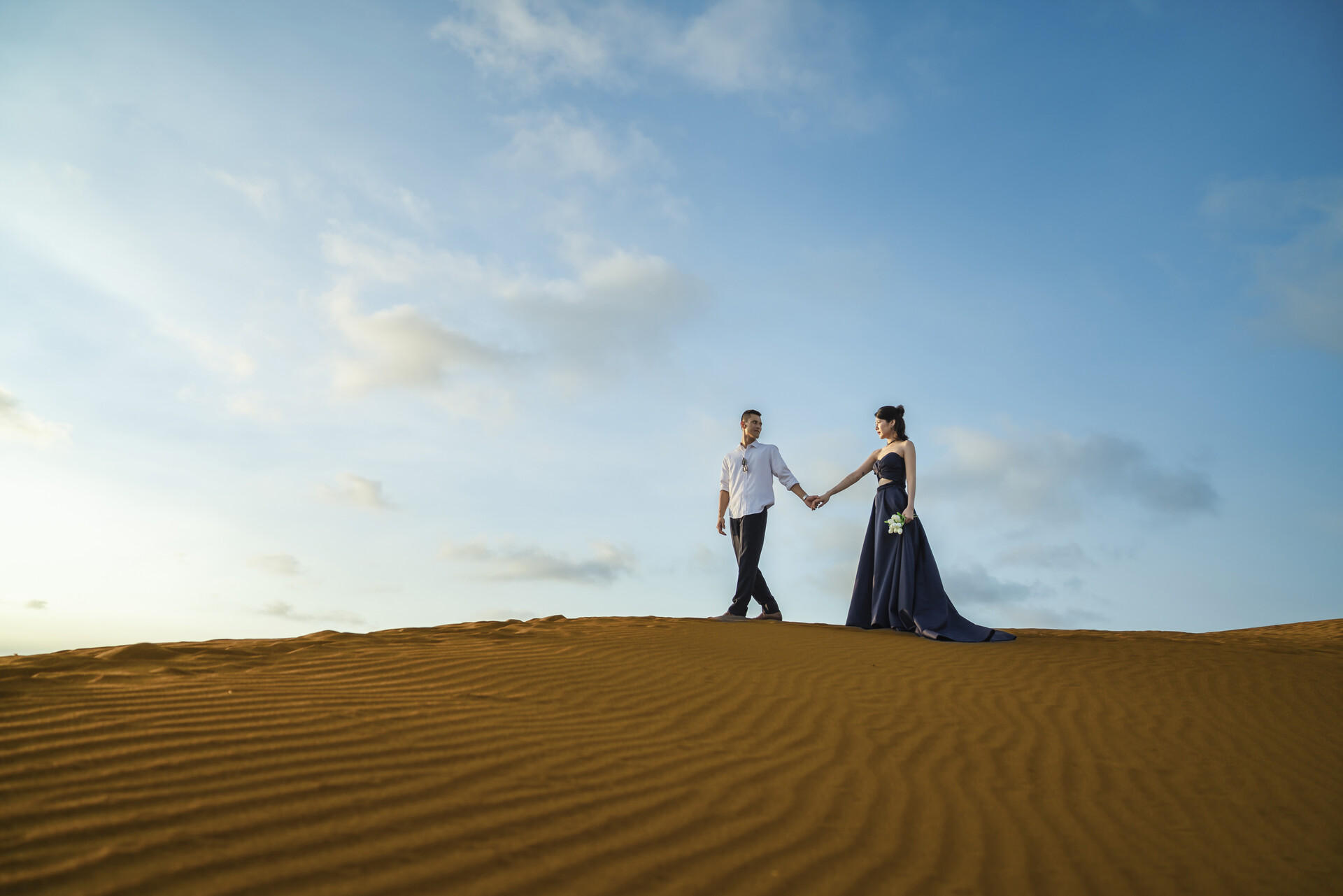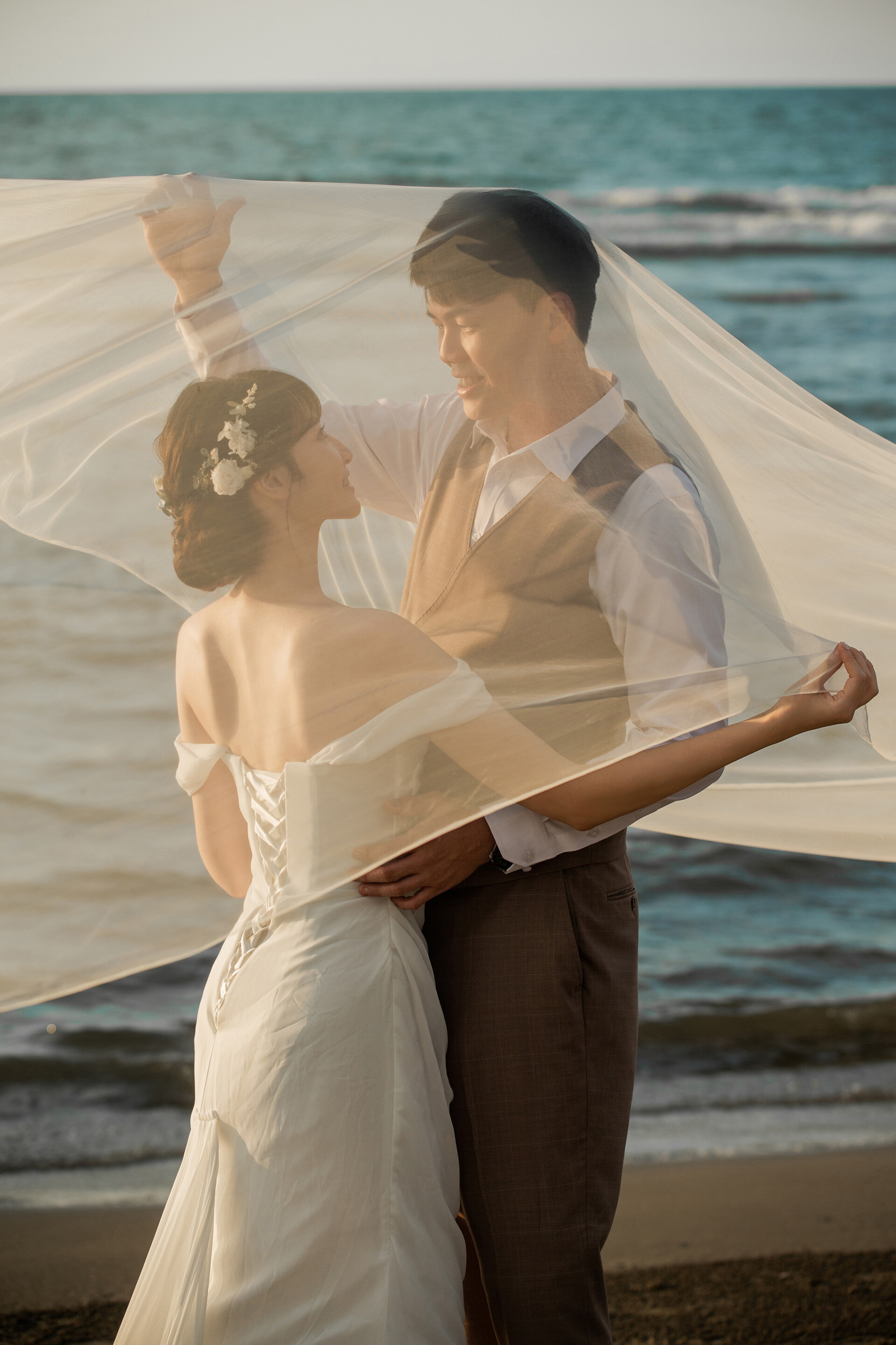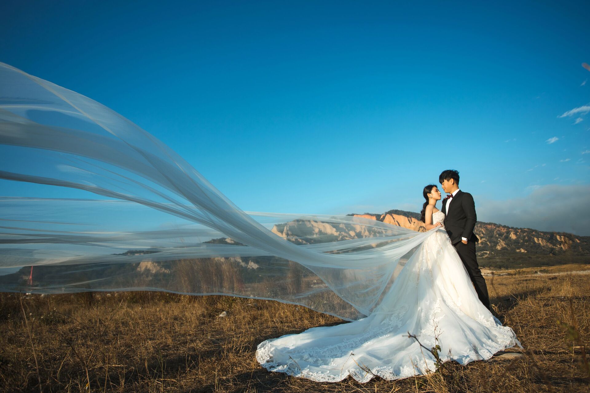 禮服選擇上,輕紗、飄逸裙襬或線條簡單的款式最能融入自然景色,讓人物與風景保持平衡。