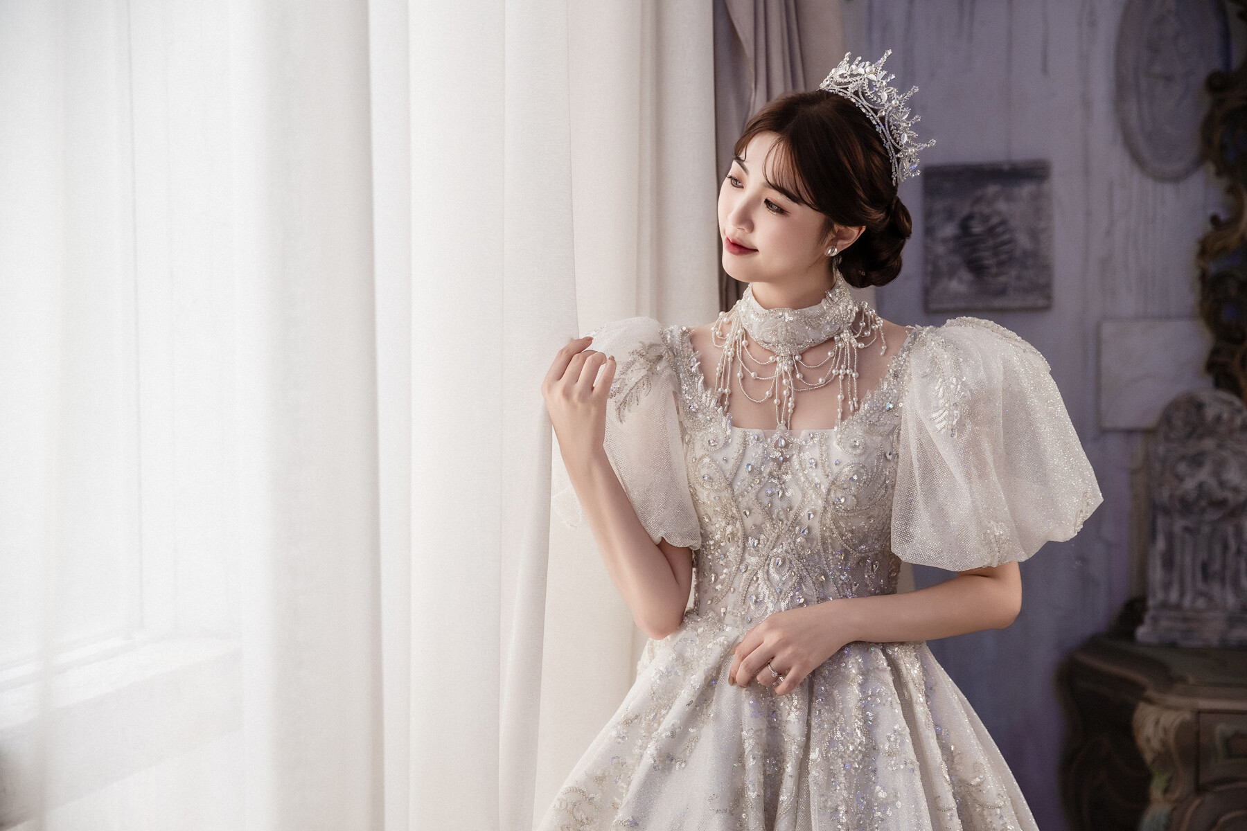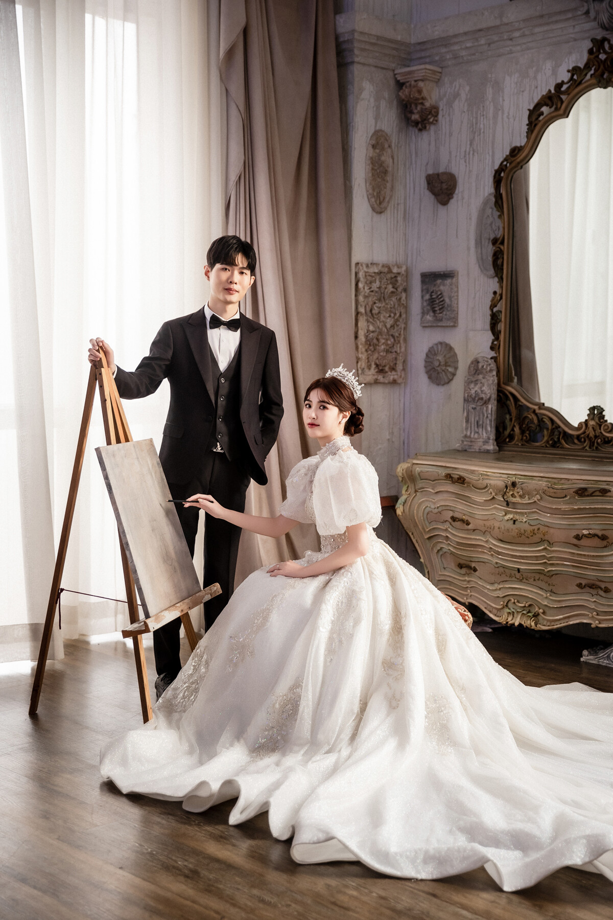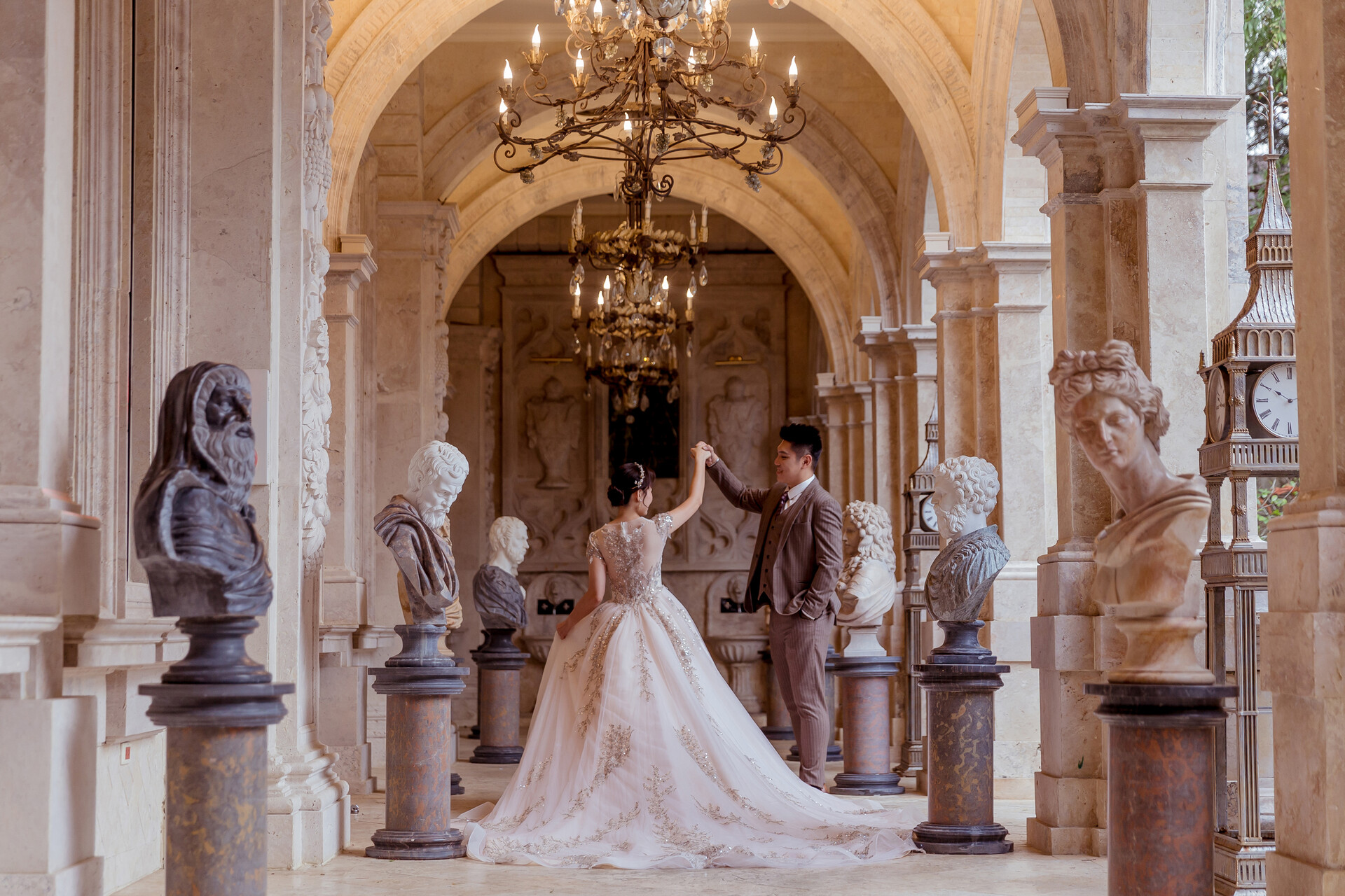 歐式婚紗往往會讓人腦海裡立刻浮現古堡、雕花柱廊、金色壁燈與 華美的室內光影。那些帶著時代痕跡的細節,彷彿走入中世紀貴族的世界,步伐也不自覺優雅起來。